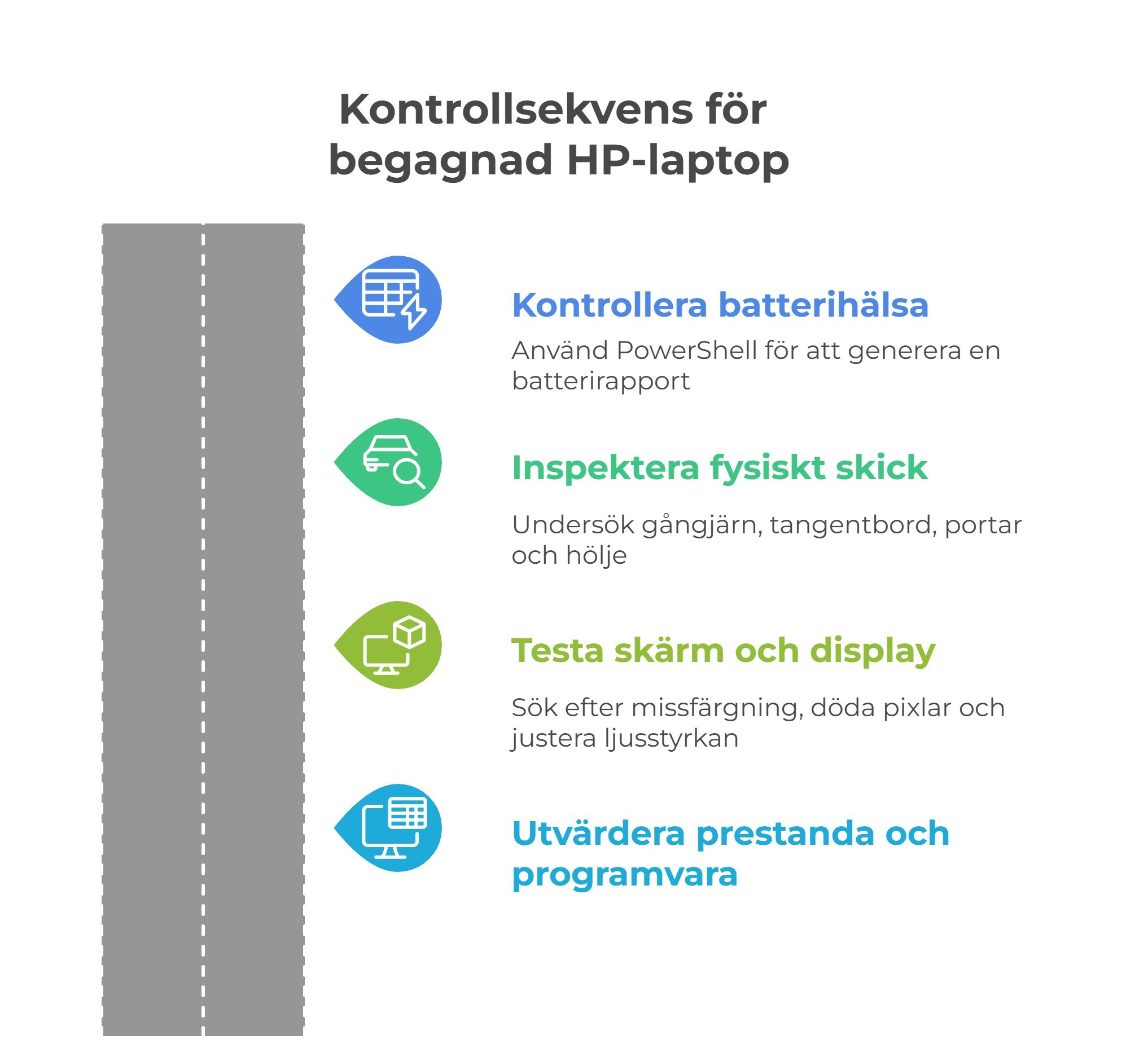 Innan du köper är det bäst att testa batterirapporten, verifiera inget BIOS-lås, kontrollera alla portar och tangentbord, inspektera skärmen för döda pixlar och köra ett stresstest med flera program. Dessa fem steg fångar 90% av problemen.