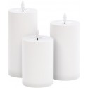 Ett set med tre LED-ljus som är designade för att användas både inomhus och utomhus. Med en IP44-klassificering är ljusen skyddade mot vattenstänk och fukt, vilket gör dem lämpliga för användning i trädgårdar, på balkonger eller vid entréer. Tillverkade av äkta stearin ger de en autentisk känsla och utseende, samtidigt som de är flamfria och säkra att använda.