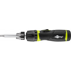 Spärrskruvmejsel med mjukt gummigrepp, 12 bits och inbyggd bitshållare i skaftet. Kan enkelt byta grepp från batong till pistol.