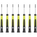 Set med 7 precisionsskruvmejslar som kombinerar hög kvalitet, ergonomisk design och magnetiska spetsar för exakt och bekvämt arbete med elektronik och finmekanik. Det kompakta och robusta setet i härdat krom-vanadiumstål är ett oumbärligt verktyg för alla som värdesätter precision och hållbarhet.