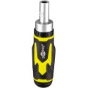 Det korta skruvmejselskaftet med gummerat handtag och praktisk spärrfunktion ligger perfekt i handen och minskar trötthet vid längre arbetspass. Setet innehåller en Y-bit för att enkelt dra åt krokar, en adapter för hylsor, sex CRV-hylsor från 5 till 10 mm samt trettiosex slagtåliga S2-stålbits i olika utföranden – flatskårna, krysspår (PH, PZ), insex (H, hex pin) och 6-kantig stjärna (T, TH). Oavsett om du monterar möbler, reparerar elektronik eller finjusterar detaljer får du alltid rätt verktyg nära till hands.